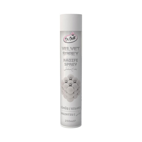 Colorantul alimentar catifea Spray 250 ML - argintiu, oferit de Dr Gusto, este soluția ideală pentru decorarea și colorarea prăjiturilor și deserturilor dumneavoastră.