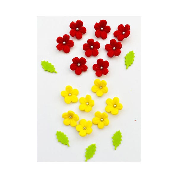Acest set de flori din pasta de zahar este compus din 20 de bucăți, având culorile roșu și galben. Este ideal pentru decorarea torturilor și prăjiturilor, oferind un aspect elegant și festiv deserturilor tale.