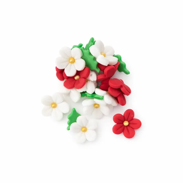 Flori din pasta de zahar roșii și albe, ideale pentru decorarea torturilor și a altor produse de cofetărie. Cutia conține 20 de bucăți, incluzând 15 flori în două nuanțe și 5 frunze.