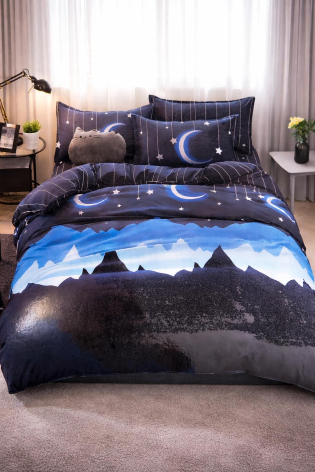 Lenjeria de pat are doua fete, pe o parte un imprimeu, pe cealalta alt imprimeu, astfe ca poti de fiecare data sa schimbi decorul camerei.