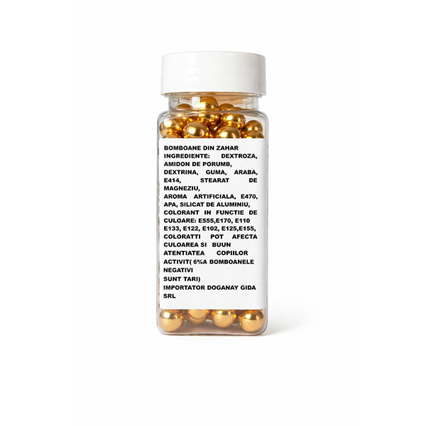 Bomboanele pentru decor aurii sunt ideale pentru a adăuga o notă de eleganță și rafinament deserturilor tale. Cu o dimensiune de 10 mm, aceste perle de zahăr sunt perfecte pentru ornarea torturilor, prăjiturilor și altor delicii dulci.