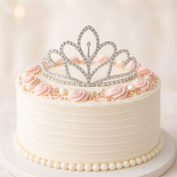 Adaugă un plus de eleganță tortului tău cu această tiară cake topper premium, realizată din aliaj metalic rezistent și decorată cu strasuri strălucitoare.